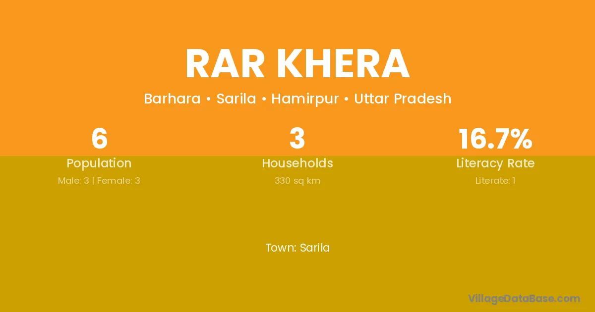 Rar Khera village has a total population of 6 people, of which 3 are males and 3 are females.
