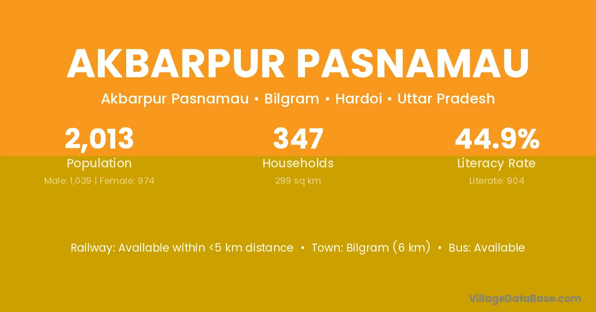 Bilgram (6 km) is the nearest town to Akbarpur Pasnamau village for major economic activities and is located approximately 6 km away.