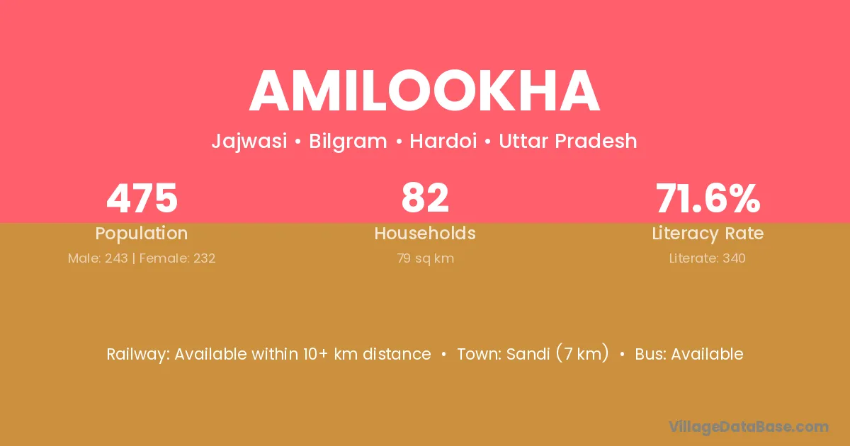 Amilookha village has a total population of 475 people, of which 243 are males and 232 are females.