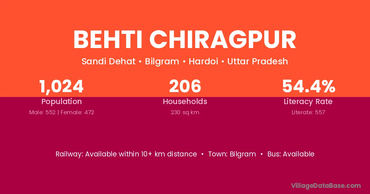 Behti Chiragpur village has a total population of 1,024 people, of which 552 are males and 472 are females.