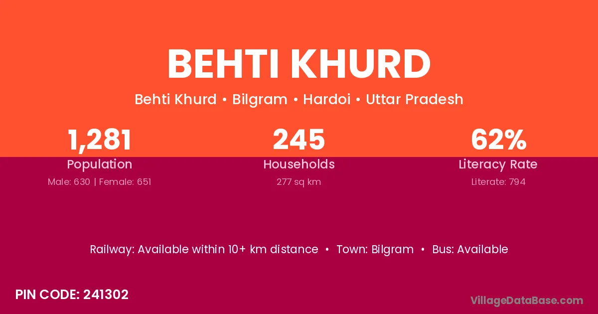 Behti Khurd village has a total population of 1,281 people, of which 630 are males and 651 are females.