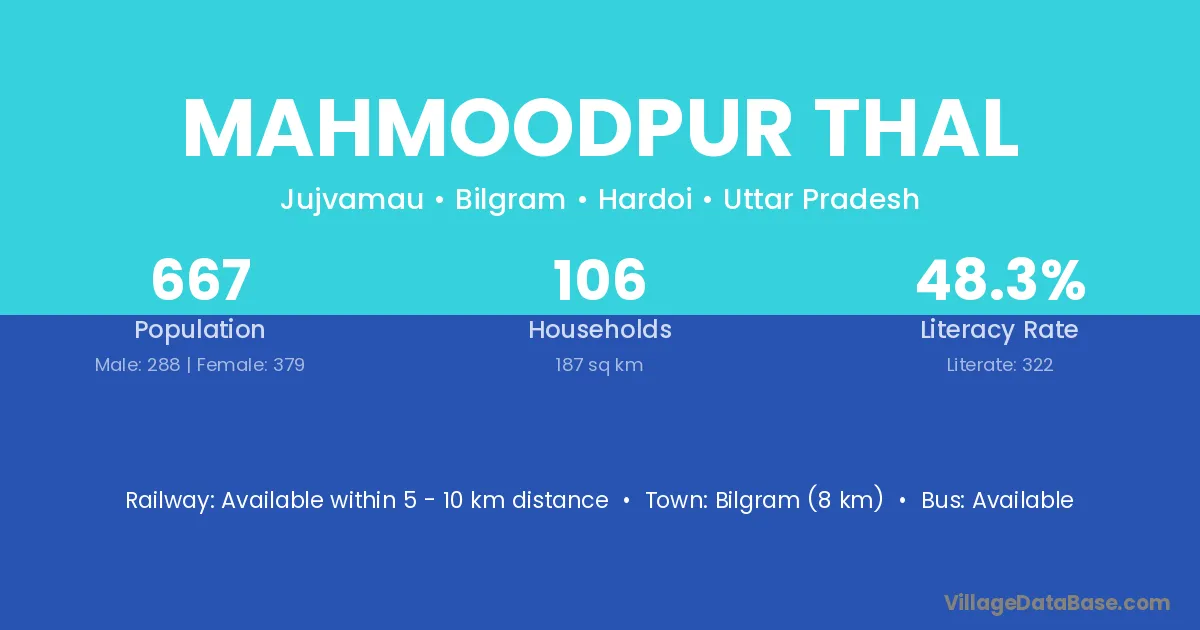 Bilgram (8 km) is the nearest town to Mahmoodpur Thal village for major economic activities and is located approximately 8 km away.