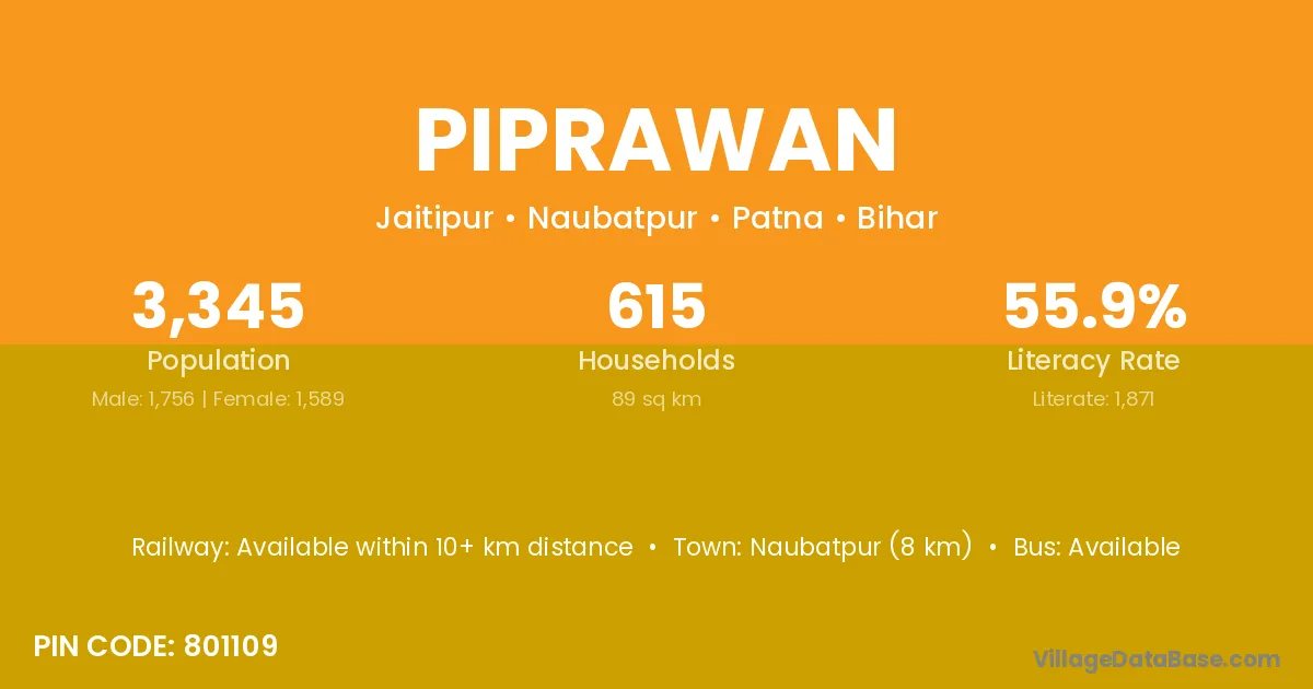 The literacy rate of Piprawan village is 65.86%. Male literacy stands at 74.98% and female literacy at 54.58%.
