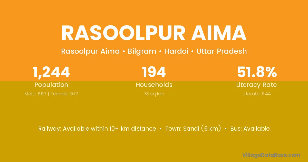 Sandi (6 km) is the nearest town to Rasoolpur Aima village for major economic activities and is located approximately 6 km away.