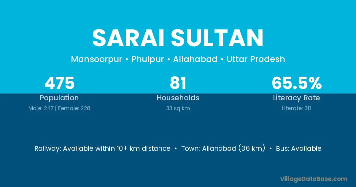 The literacy rate of Sarai Sultan village is 49.12%. Male literacy stands at 62.15% and female literacy at 34.73%.