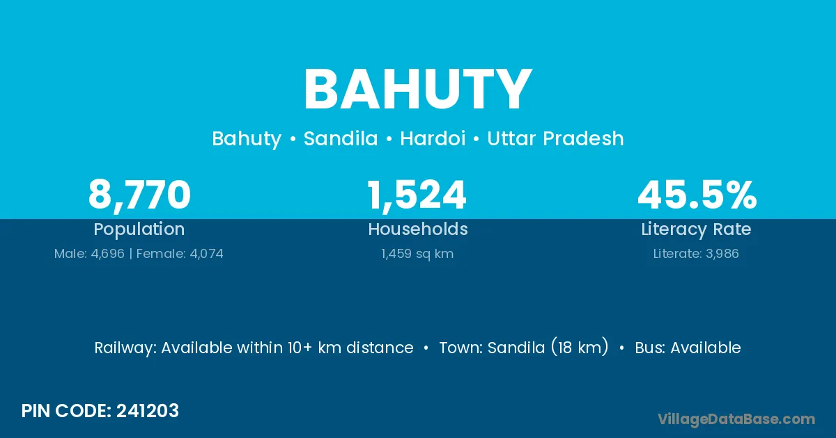 Sandila (18 km) is the nearest town to Bahuty village for major economic activities and is located approximately 18 km away.