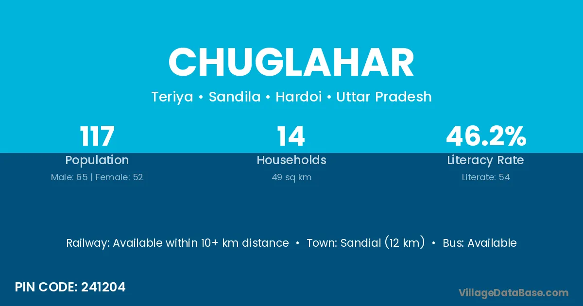 Chuglahar village has a total population of 117 people, of which 65 are males and 52 are females.