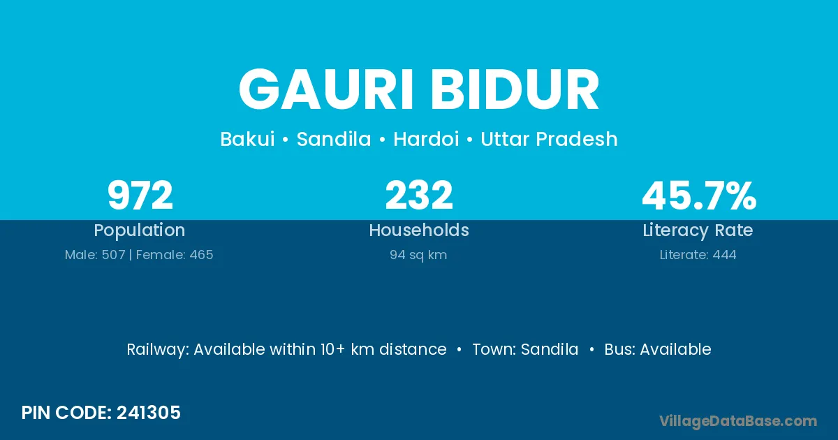 Gauri Bidur village has a total population of 972 people, of which 507 are males and 465 are females.