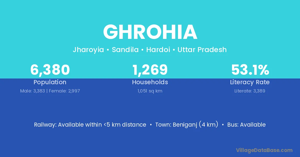 Ghrohia village has a total population of 6,380 people, of which 3,383 are males and 2,997 are females.