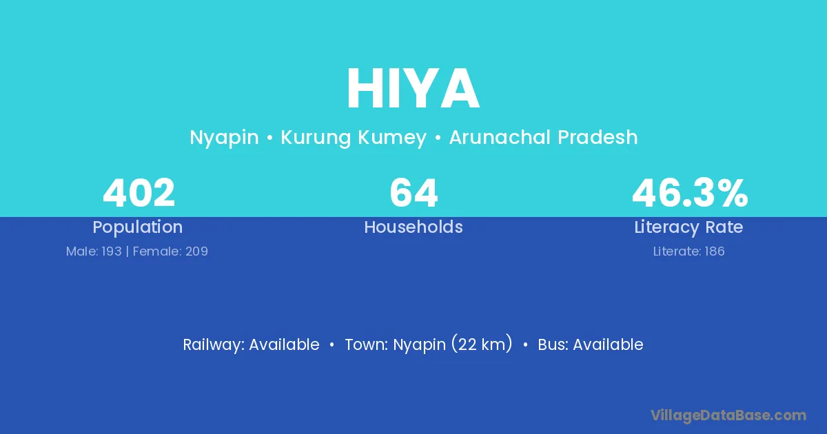 The literacy rate of Hiya village is 46.78%. Male literacy stands at 55.18% and female literacy at 37.13%.