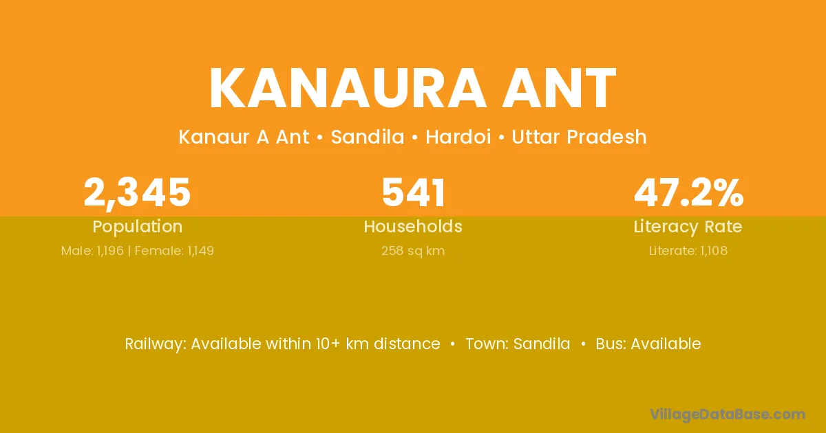 Kanaura Ant village has a total population of 2,345 people, of which 1,196 are males and 1,149 are females.