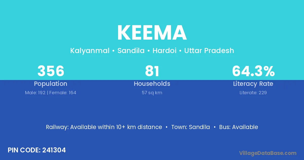 According to Census 2011 information, the village code of Keema village is 241304.