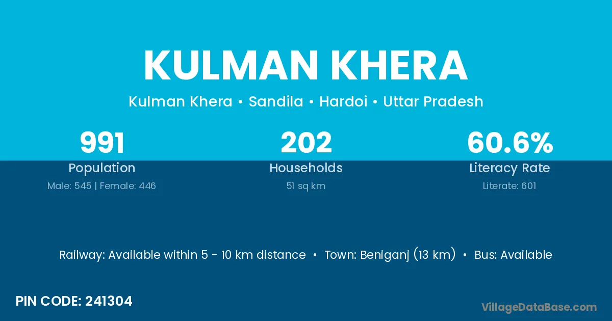Kulman Khera village has a total population of 991 people, of which 545 are males and 446 are females.