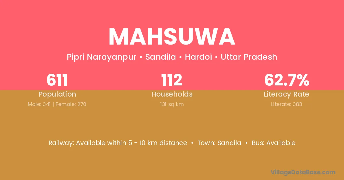 Mahsuwa village has a total population of 611 people, of which 341 are males and 270 are females.