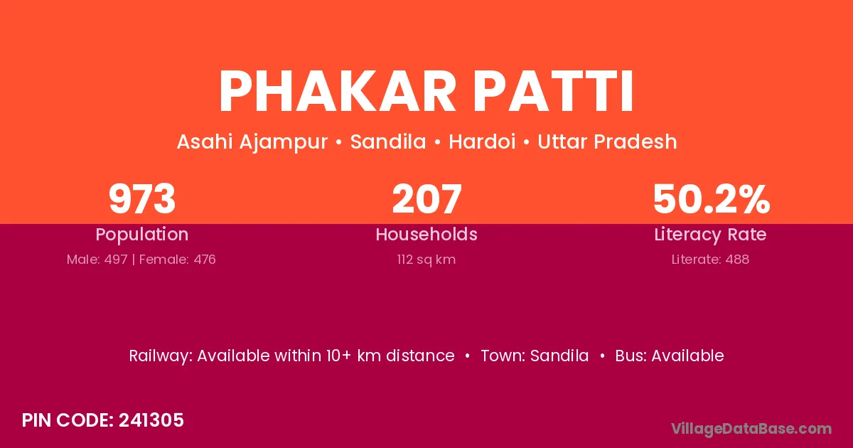 Phakar Patti village has a total population of 973 people, of which 497 are males and 476 are females.