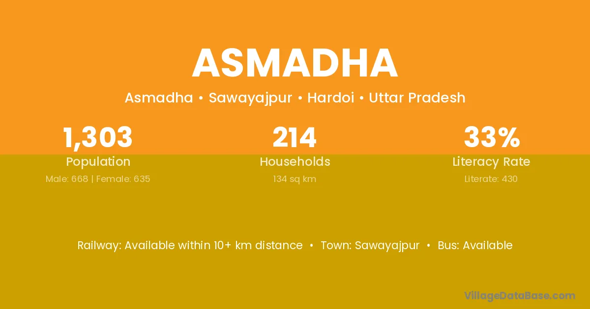 Asmadha village has a total population of 1,303 people, of which 668 are males and 635 are females.