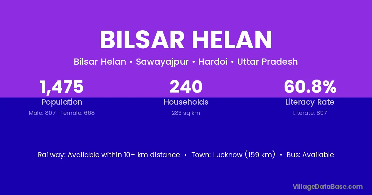 Lucknow (159 km) is the nearest town to Bilsar Helan village for major economic activities and is located approximately 159 km away.
