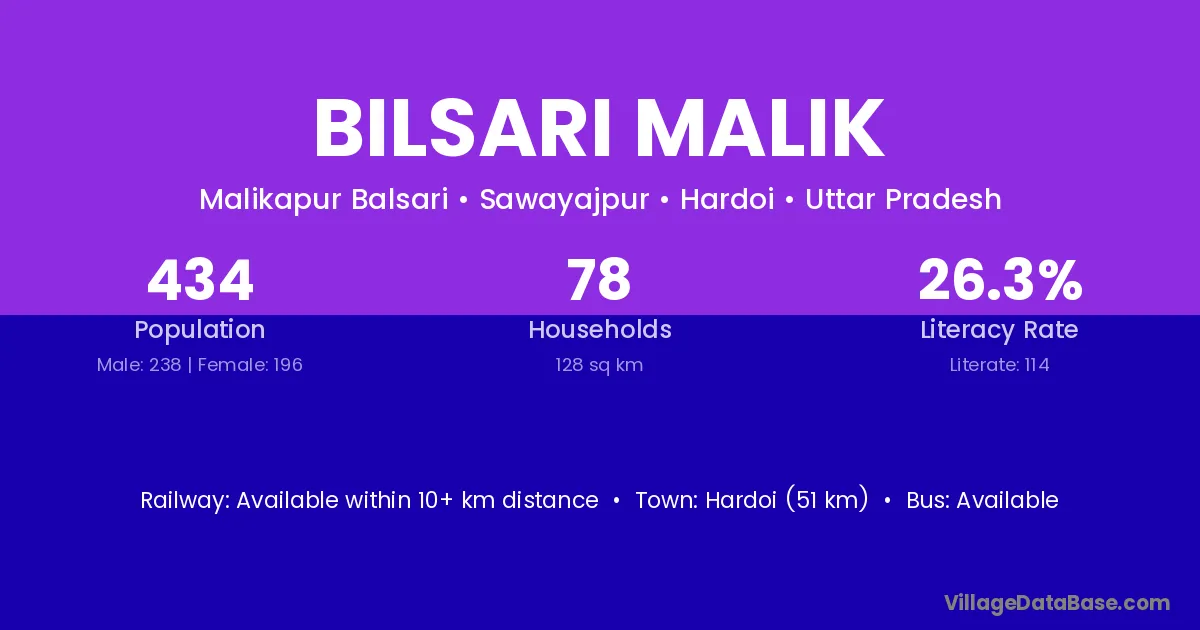 Hardoi (51 km) is the nearest town to Bilsari Malik village for major economic activities and is located approximately 51 km away.