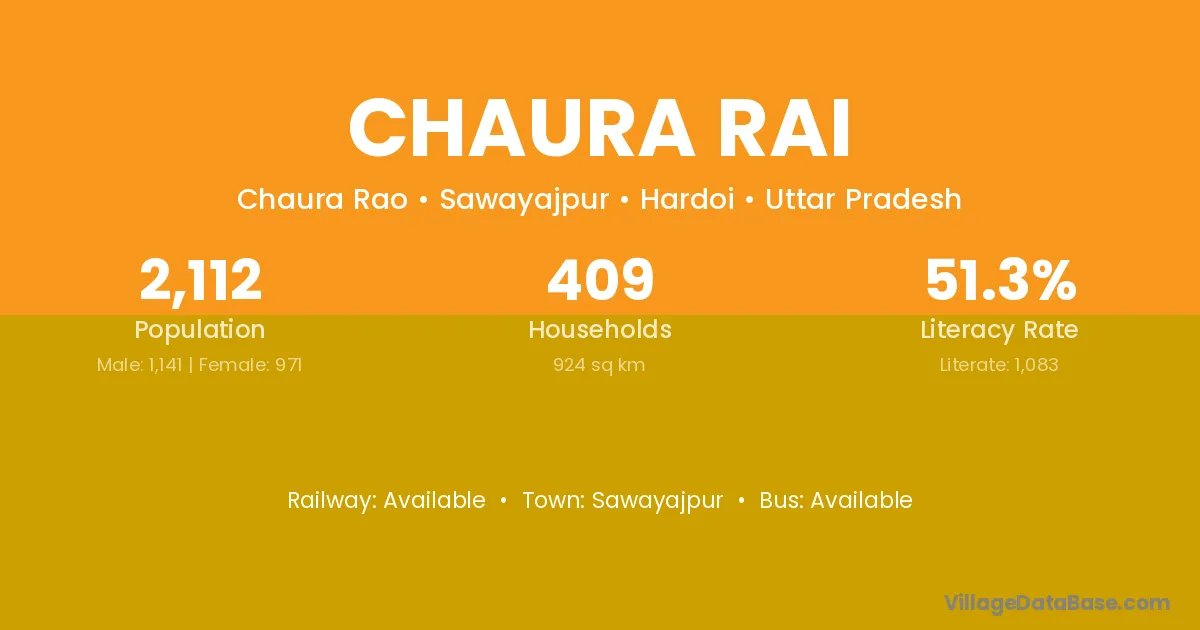 Chaura Rai village has a total population of 2,112 people, of which 1,141 are males and 971 are females.