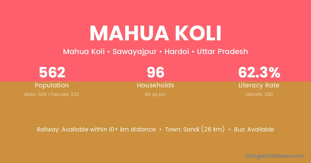 Sandi (26 km) is the nearest town to Mahua Koli village for major economic activities and is located approximately 26 km away.