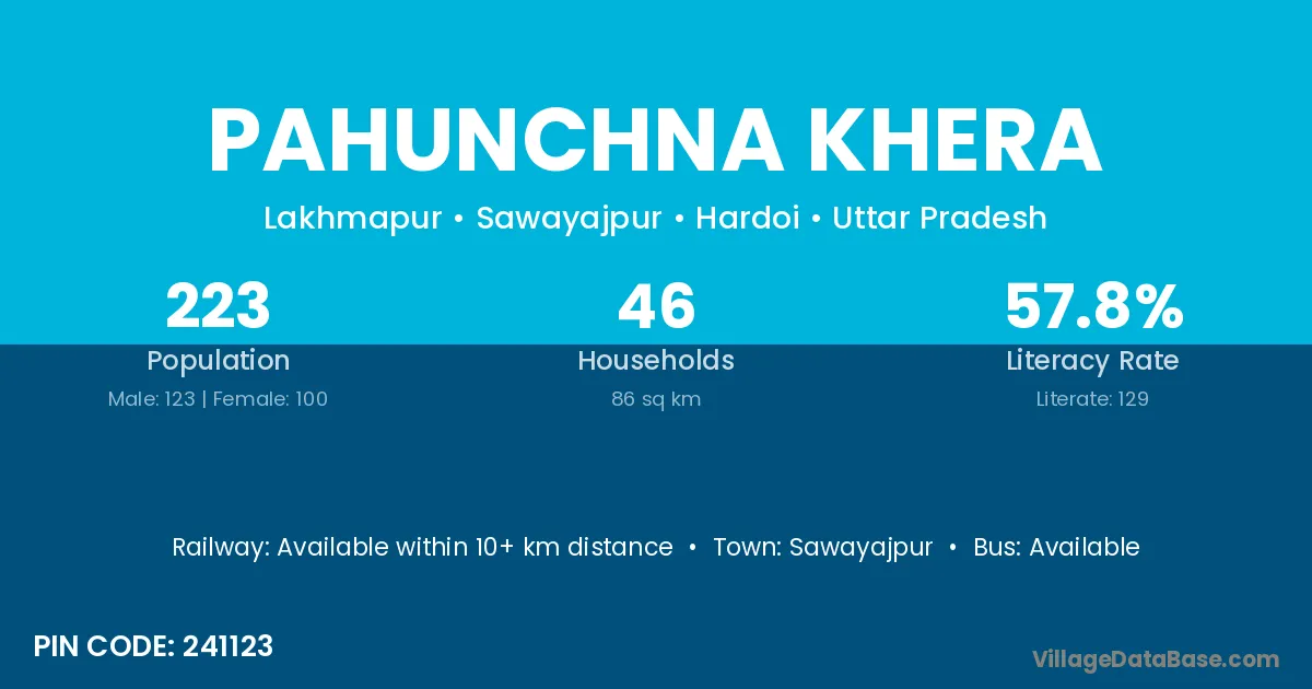Pahunchna Khera village has a total population of 223 people, of which 123 are males and 100 are females.