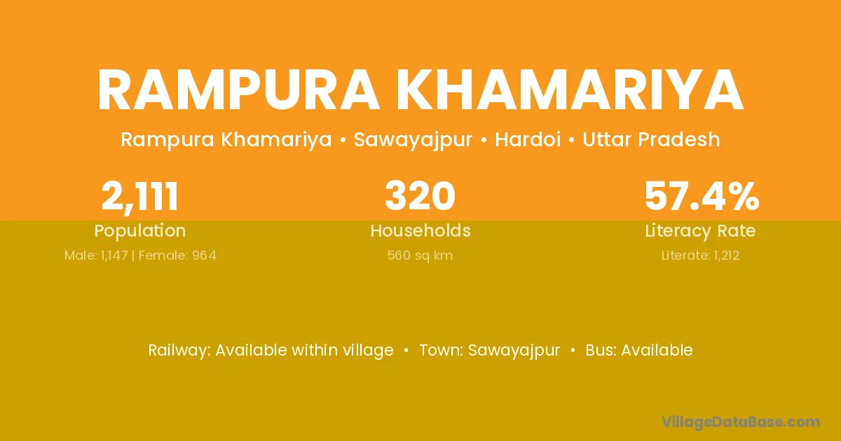 Rampura Khamariya village has a total population of 2,111 people, of which 1,147 are males and 964 are females.