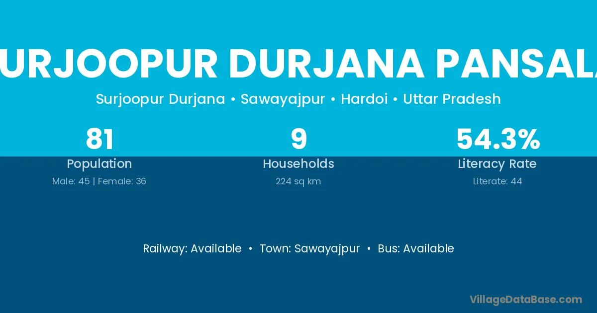 Surjoopur Durjana Pansala village has a total population of 81 people, of which 45 are males and 36 are females.