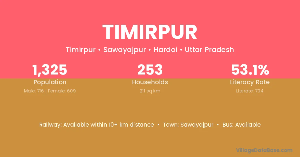 Timirpur village has a total population of 1,325 people, of which 716 are males and 609 are females.