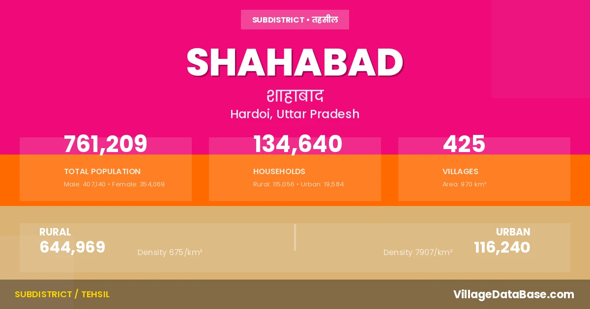 According to the 2011 census The total area of Shahabad Tehsil is 970 km², with a population of 761209 people. The population density is 785 inhabitants per square kilometre, and there are approximately 134640 houses in the sub district.
