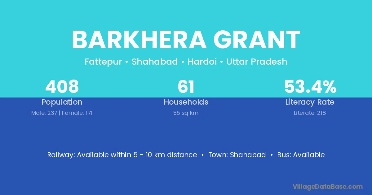 Barkhera Grant village has a total population of 408 people, of which 237 are males and 171 are females.