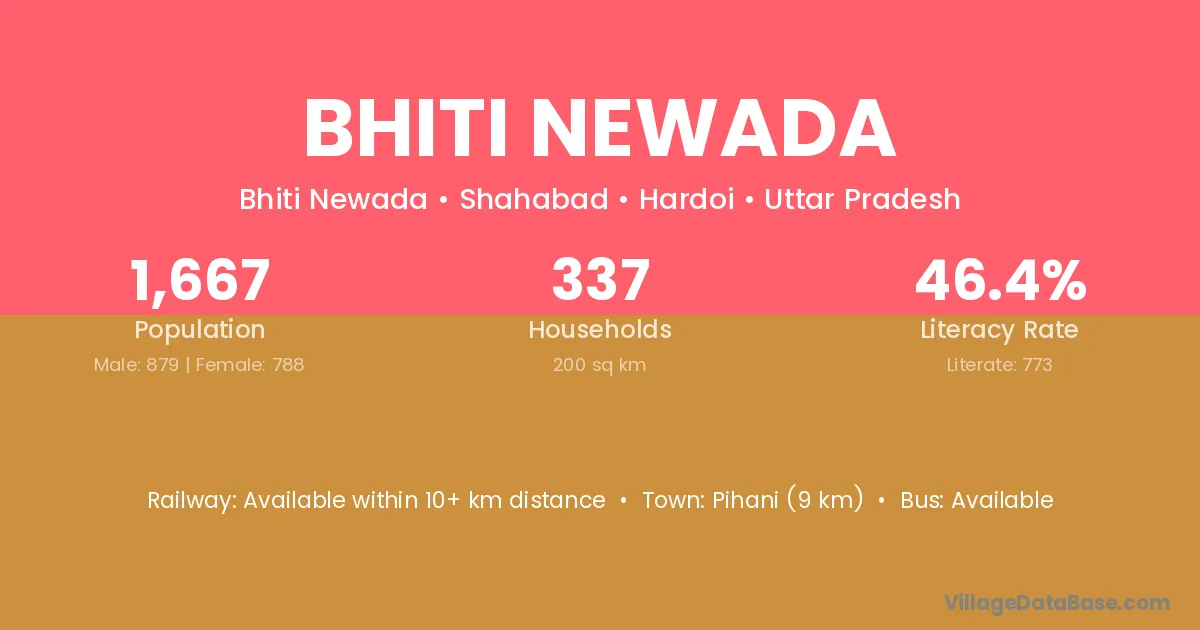 Pihani (9 km) is the nearest town to Bhiti Newada village for major economic activities and is located approximately 9 km away.