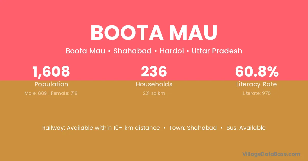 Boota Mau village has a total population of 1,608 people, of which 889 are males and 719 are females.