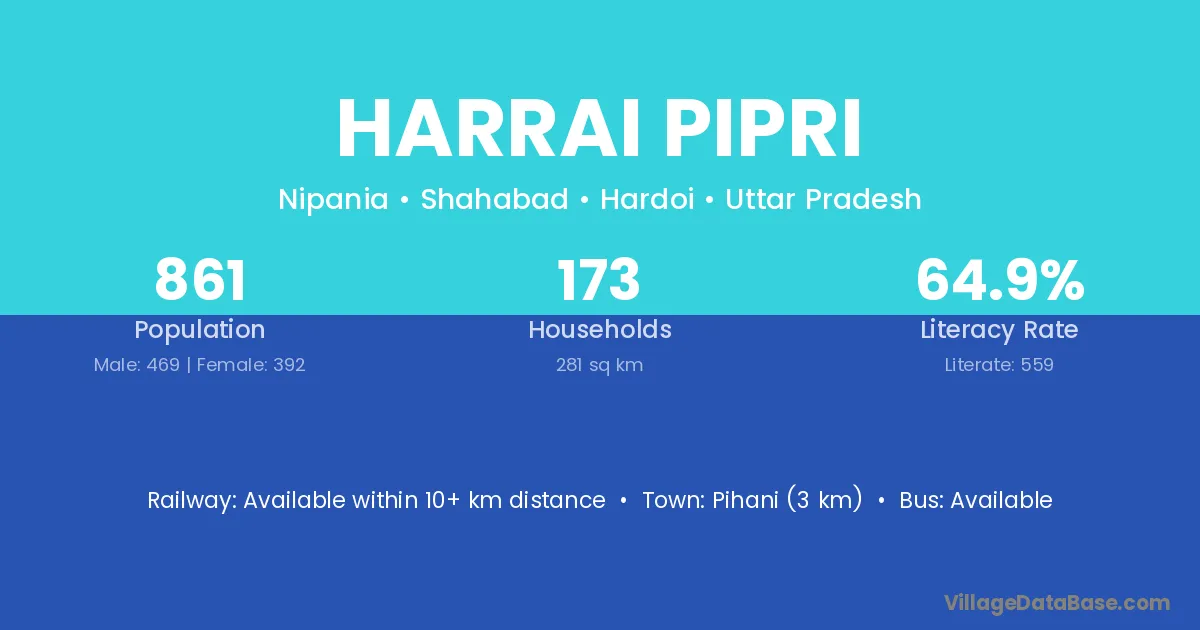 Pihani (3 km) is the nearest town to Harrai Pipri village for major economic activities and is located approximately 3 km away.