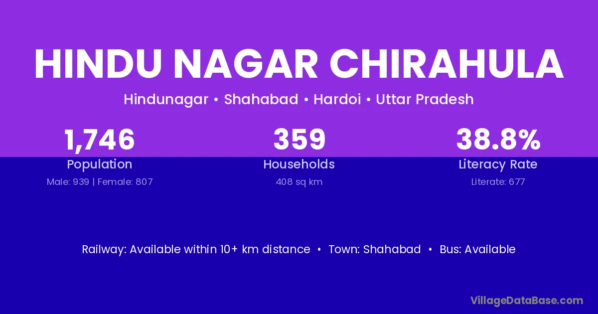 Hindu Nagar Chirahula village has a total population of 1,746 people, of which 939 are males and 807 are females.