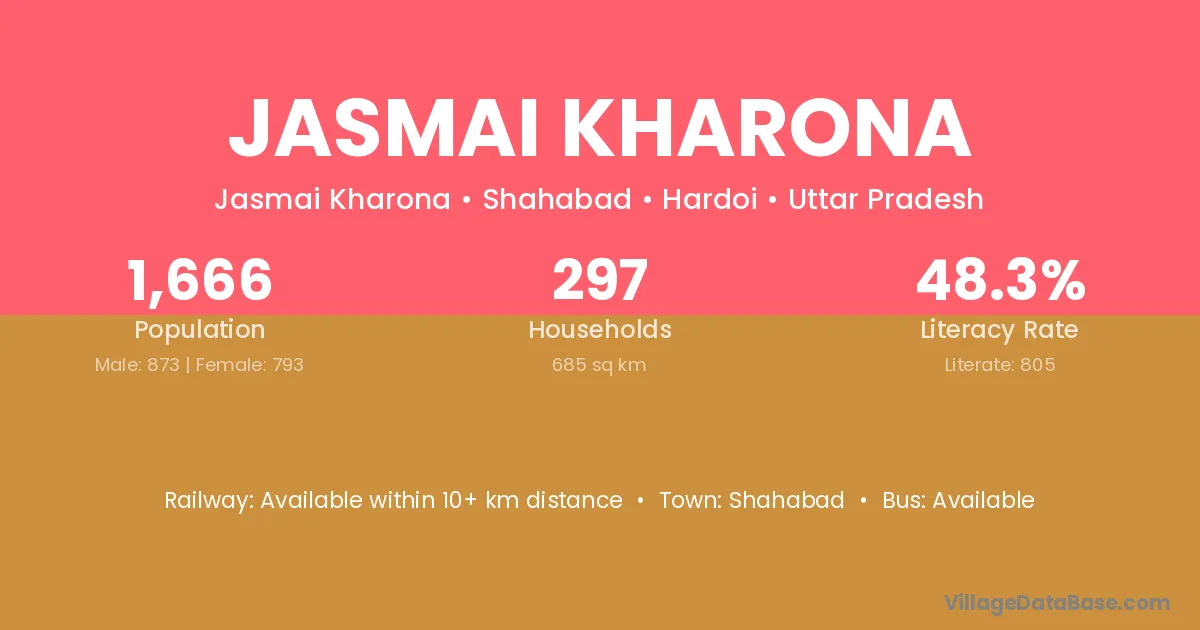 Jasmai Kharona village has a total population of 1,666 people, of which 873 are males and 793 are females.