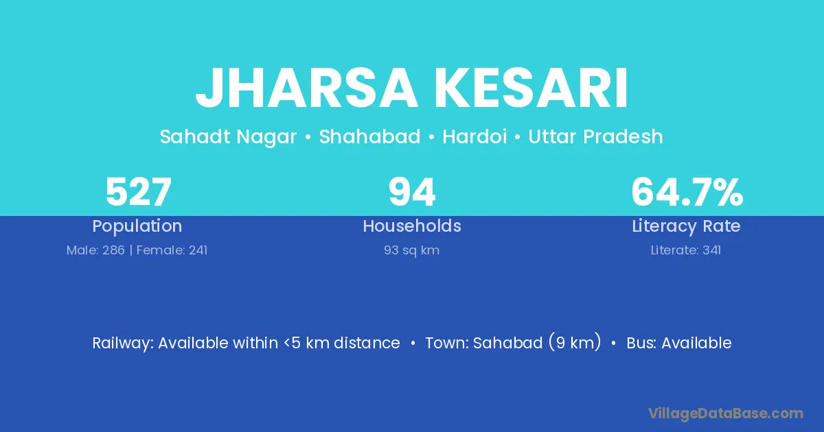 Sahabad (9 km) is the nearest town to Jharsa Kesari village for major economic activities and is located approximately 9 km away.