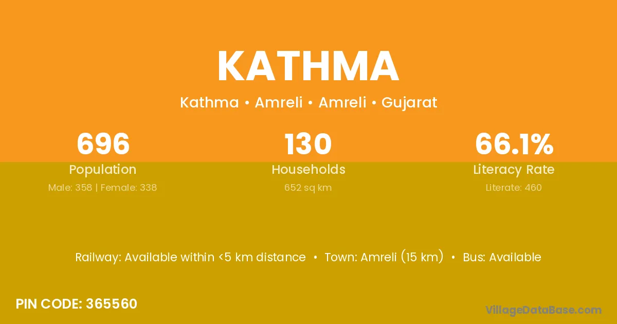 The literacy rate of Kathma village is 41.69%. Male literacy stands at 49.81% and female literacy at 32.92%.