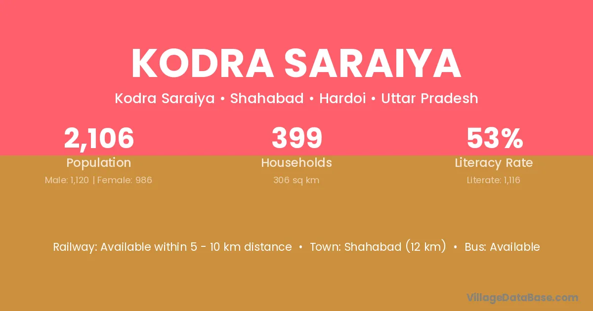 Shahabad (12 km) is the nearest town to Kodra Saraiya village for major economic activities and is located approximately 12 km away.