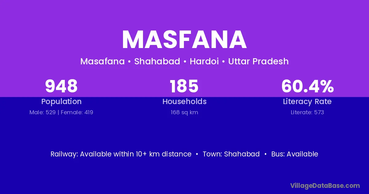 Masfana village has a total population of 948 people, of which 529 are males and 419 are females.