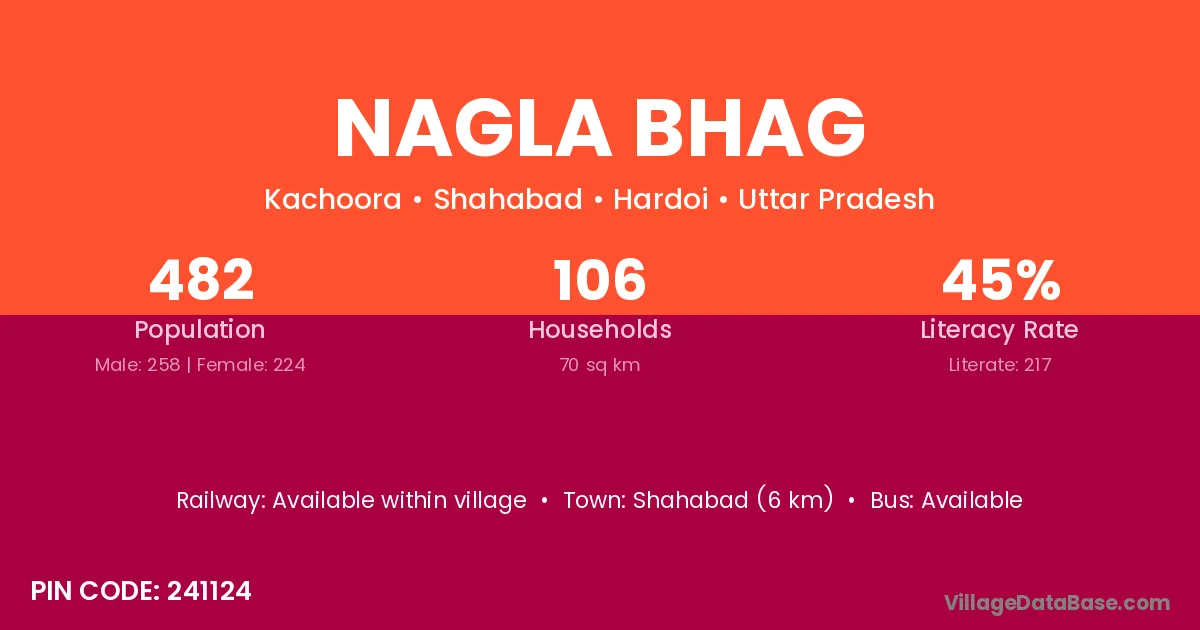 Nagla Bhag village has a total population of 482 people, of which 258 are males and 224 are females.