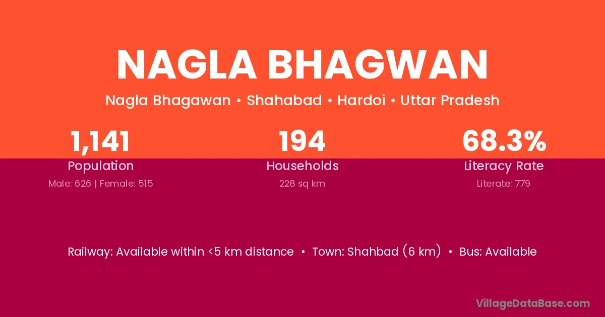Nagla Bhagwan village has a total population of 1,141 people, of which 626 are males and 515 are females.