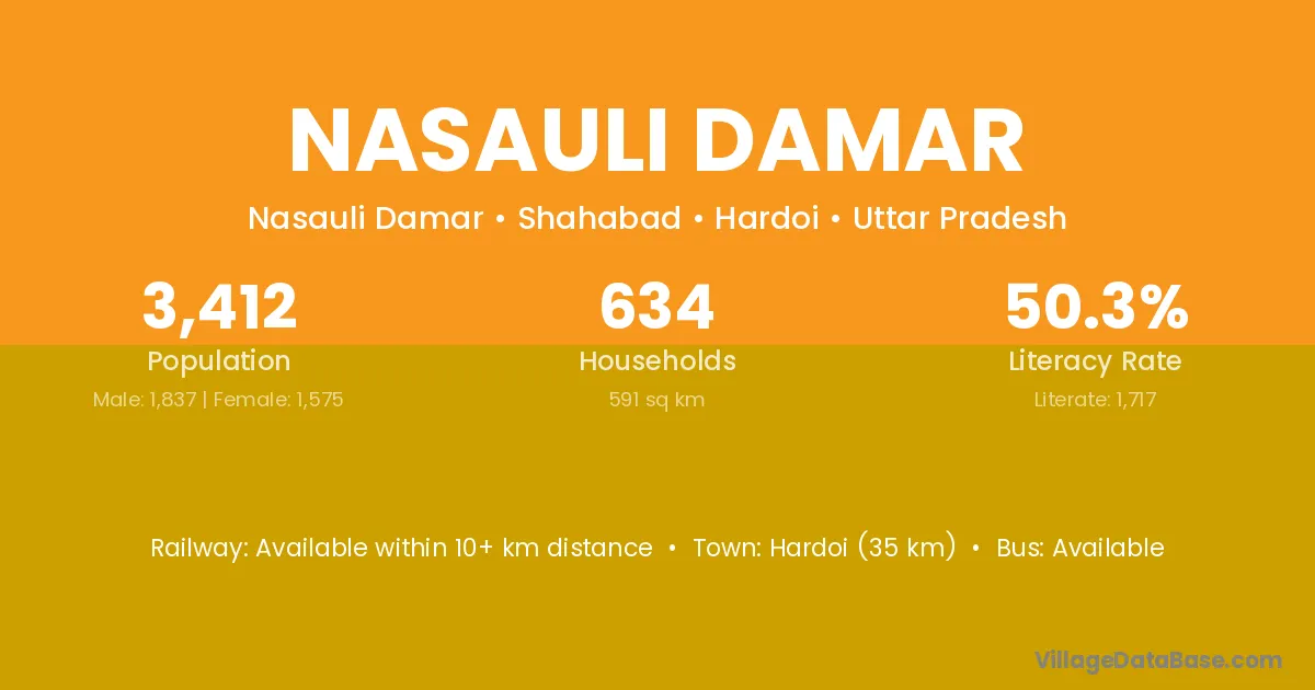 Hardoi (35 km) is the nearest town to Nasauli Damar village for major economic activities and is located approximately 35 km away.