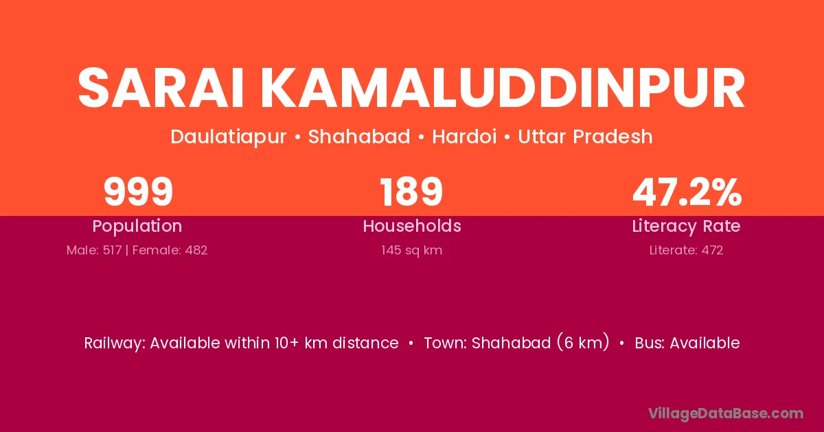 Sarai Kamaluddinpur village has a total population of 999 people, of which 517 are males and 482 are females.