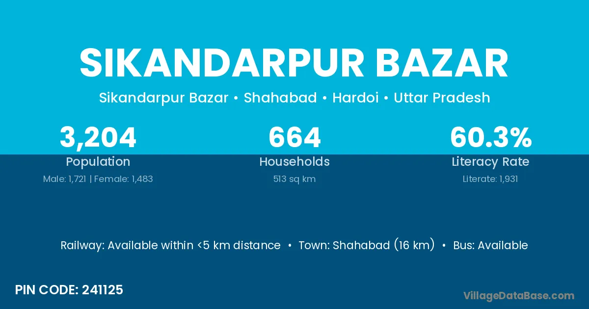 Shahabad (16 km) is the nearest town to Sikandarpur Bazar village for major economic activities and is located approximately 16 km away.