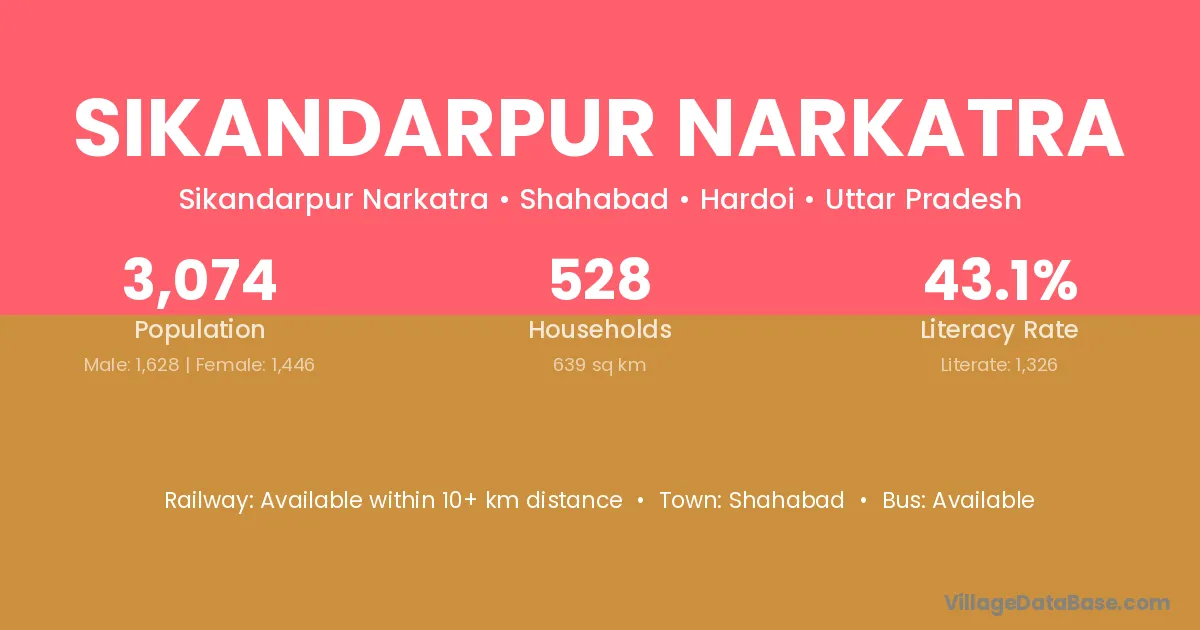 Sikandarpur Narkatra village has a total population of 3,074 people, of which 1,628 are males and 1,446 are females.