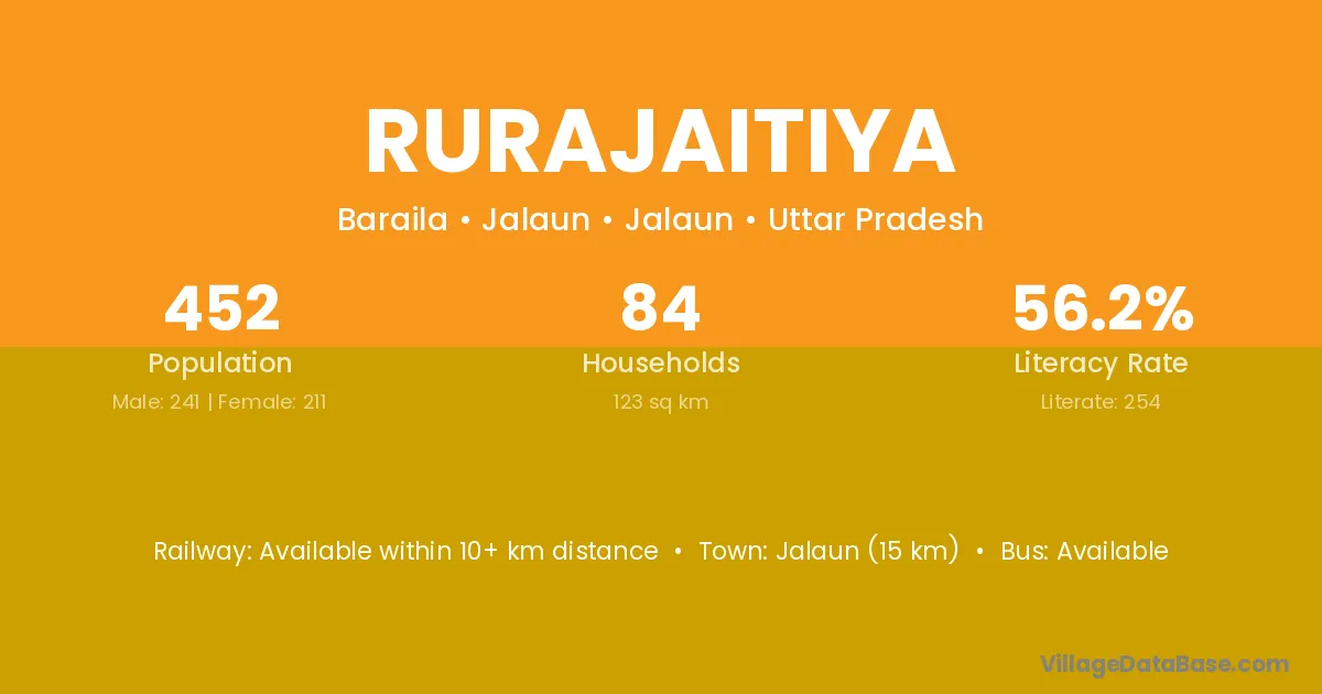 Jalaun (15 km) is the nearest town to Rurajaitiya village for major economic activities and is located approximately 15 km away.