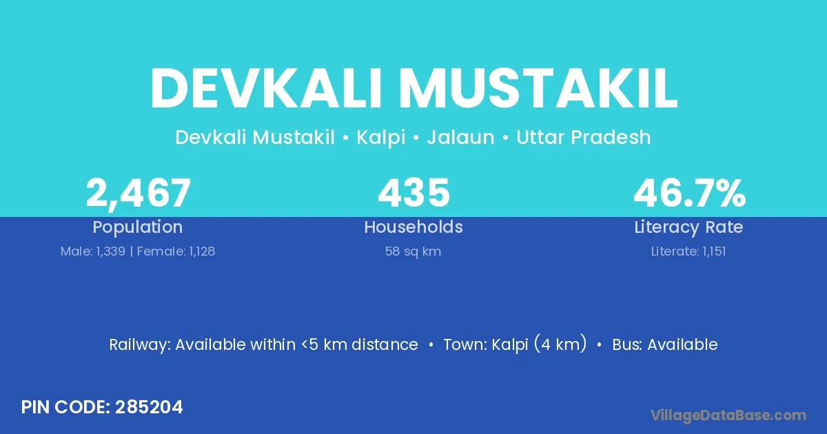 Kalpi (4 km) is the nearest town to Devkali Mustakil village for major economic activities and is located approximately 4 km away.