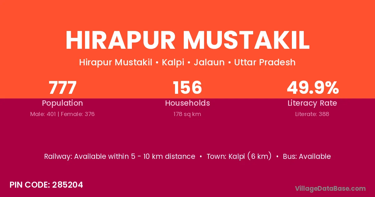 Kalpi (6 km) is the nearest town to Hirapur Mustakil village for major economic activities and is located approximately 6 km away.