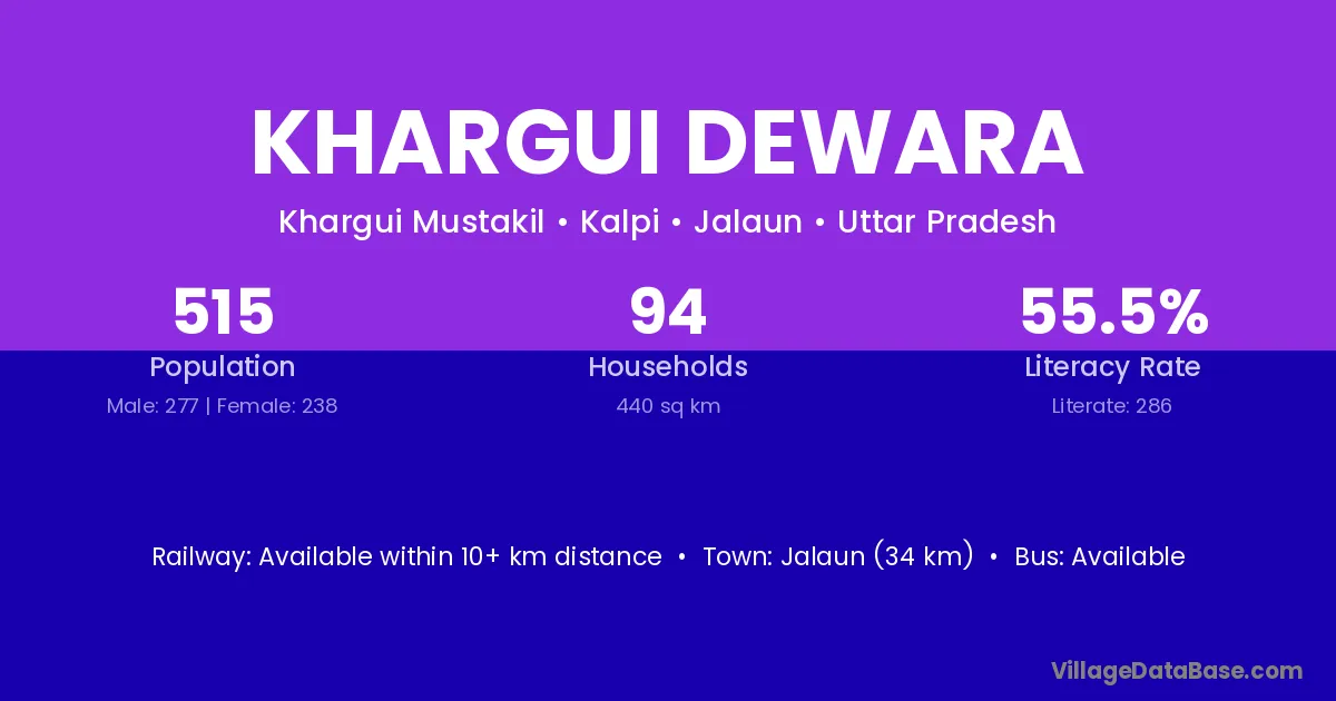 Jalaun (34 km) is the nearest town to Khargui Dewara village for major economic activities and is located approximately 34 km away.