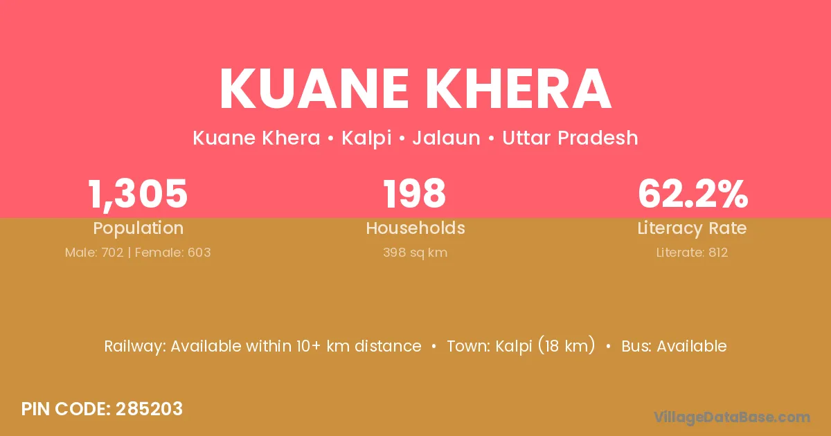 Kalpi (18 km) is the nearest town to Kuane Khera village for major economic activities and is located approximately 18 km away.